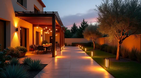Iluminar uniformemente todo el espacio exterior con luz blanca intensa es el error más común que destruye completamente el potencial atmosférico nocturno. La iluminación exterior efectiva se basa en tres capas diferenciadas: iluminación de tarea para zonas funcionales (cocina exterior, escaleras), iluminación ambiental de baja intensidad que crea atmósfera, e iluminación de acento que destaca elementos vegetales o arquitectónicos.